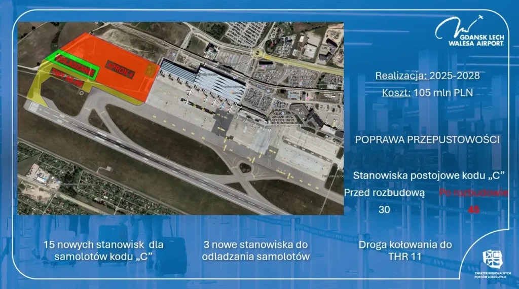 - Budowę 15 nowych stanowisk postojowych dla samolotów (łącznie 45 stanowisk po zakończeniu inwestycji).